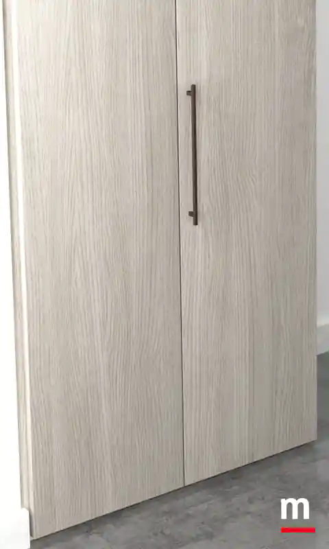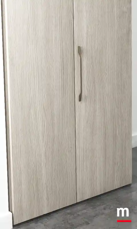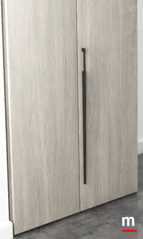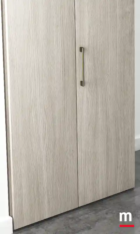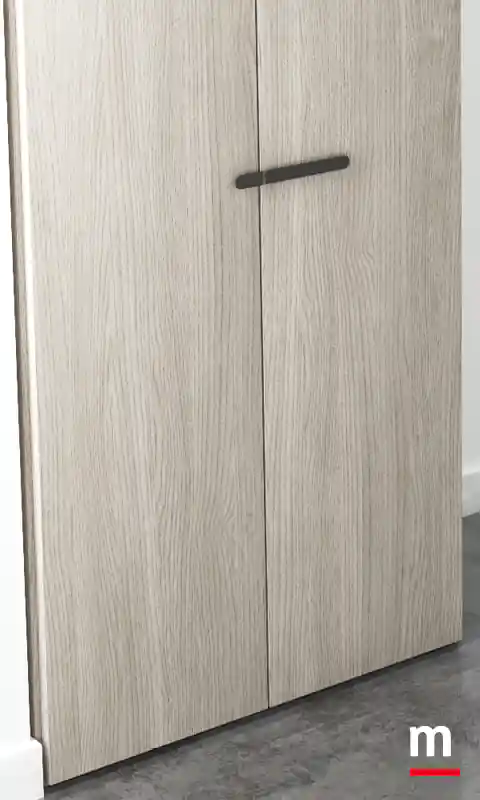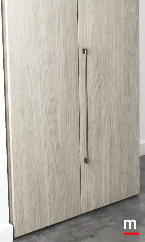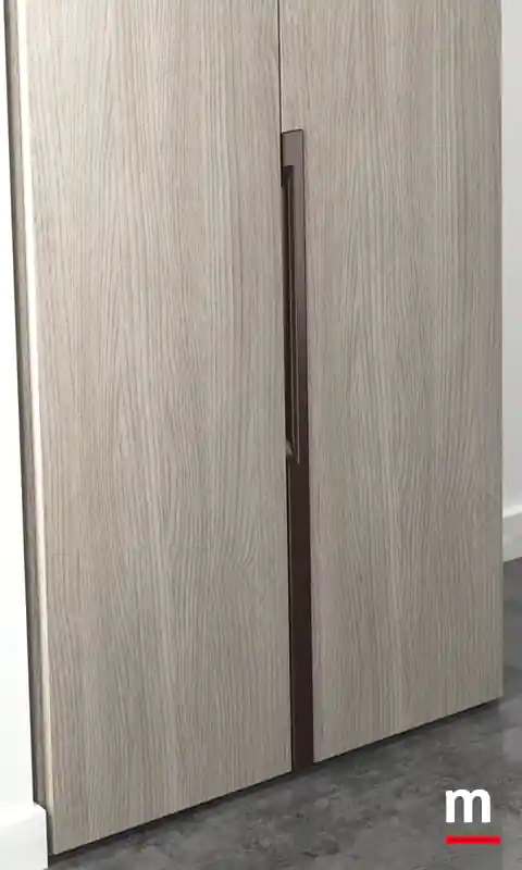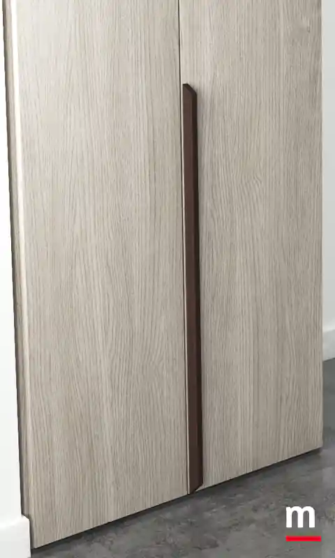 Portale a “raccordi” per chiusura ad angolo con ante soffietto. Portale a “raccordi”. Ha il potere di farci sentire dinamici. Non a caso, il portale di questa soluzione è stato studiato apposta usando meccanismi che donano movimento all’intero ambiente. Complice il sistema a “raccordi” per chiusura ad angolo con ante soffietto disponibili in vetro o in legno. Il meccanismo a soffietto è realizzato in acciaio mentre l’architrave superiore in massello finitura bianco opaco o laccato Lop. Determinante l’alternanza scelta per il finale della cabina che prosegue nell’armadio con ante in essenza Frassino Cenere e laccato opaco Porpora. L’area cabina è chiusa da ante con telaio in alluminio finitura Metal Gray e vetro Stopsol.
