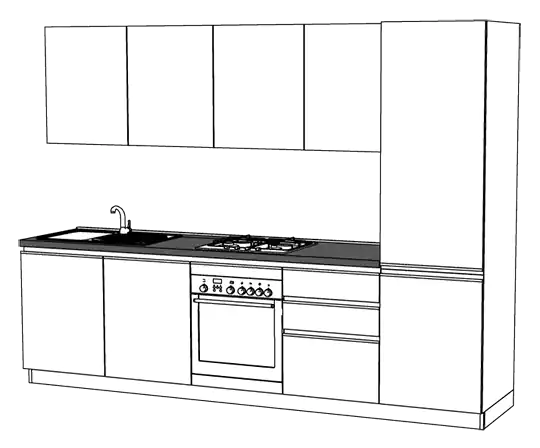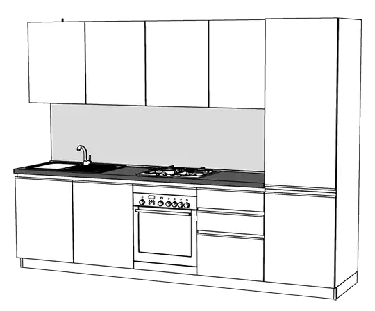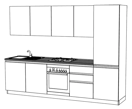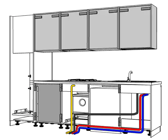 cucine con distanziale metallico applicato dietro le basi per permettere il passaggio acqua, gas e scarichi; i pensili sono appesi al muro; profondità piano di lavoro 68 cm