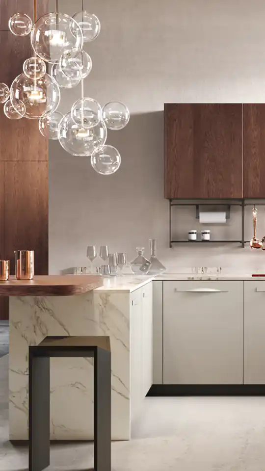 Un design innovativo in cui praticità ed estetica si fondono esaltandosi reciprocamente: mix di finiture naturali incontrano materiali e accessori di ultima generazione.